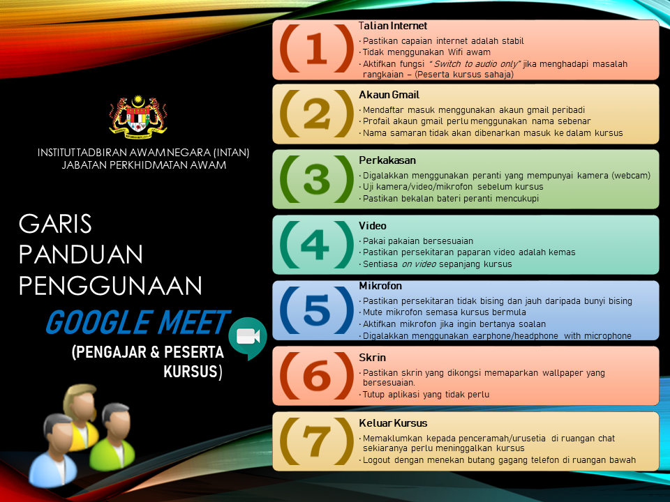 PESERTA HENDAKLAH: (A) PENGESAHAN KEHADIRAN JAM 8.30 PAGI 9.00 PAGI (B) MELETAKKAN NAMA SEBENAR KETIKA MENDAFTAR MASUK KE GOOGLE MEET BAGI PENGENALAN DIRI (C) MEMPUNYAI CAPAIAN INTERNET YANG STABIL (D) MEMPUNYAI PERALATAN ICT UNTUK TUJUAN PEMBELAJARAN ONLINE SEPERTI KOMPUTER, LAPTOP ATAU TELEFON PINTAR.