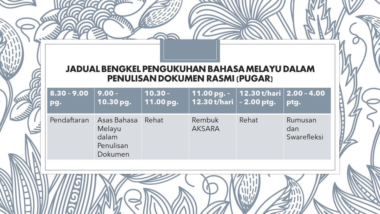 SIRI 3 BENGKEL PENGUKUHAN ASAS BAHASA MELAYU DALAM DOKUMEN RASMI KERAJAAN (PUGAR) 2025 | Bengkel ini hanya terbuka kepada pegawai-pegawai yang telah menduduki Ujian AKSARA pada 25 Februari hingga 25 Mac 2025 yang lalu. Justifikasi bengkel adalah berdasarkan asas-asas yang berikut: i. Bengkel ini merupakan salah satu inisiatif pembangunan modal insan berteraskan bahasa kebangsaan seperti yang digariskan dalam MyPPSM Ceraian PO.1.1.1: Pemerkasaan Penggunaan Bahasa Melayu Dalam Perkhidmatan Awam. ii. Intervensi di peringkat pegawai-pegawai pengurusan pertengahan bakal memberi kesan limpahan penggunaan bahasa kebangsaan yang betul kepada kementerian/jabatan/agensi.